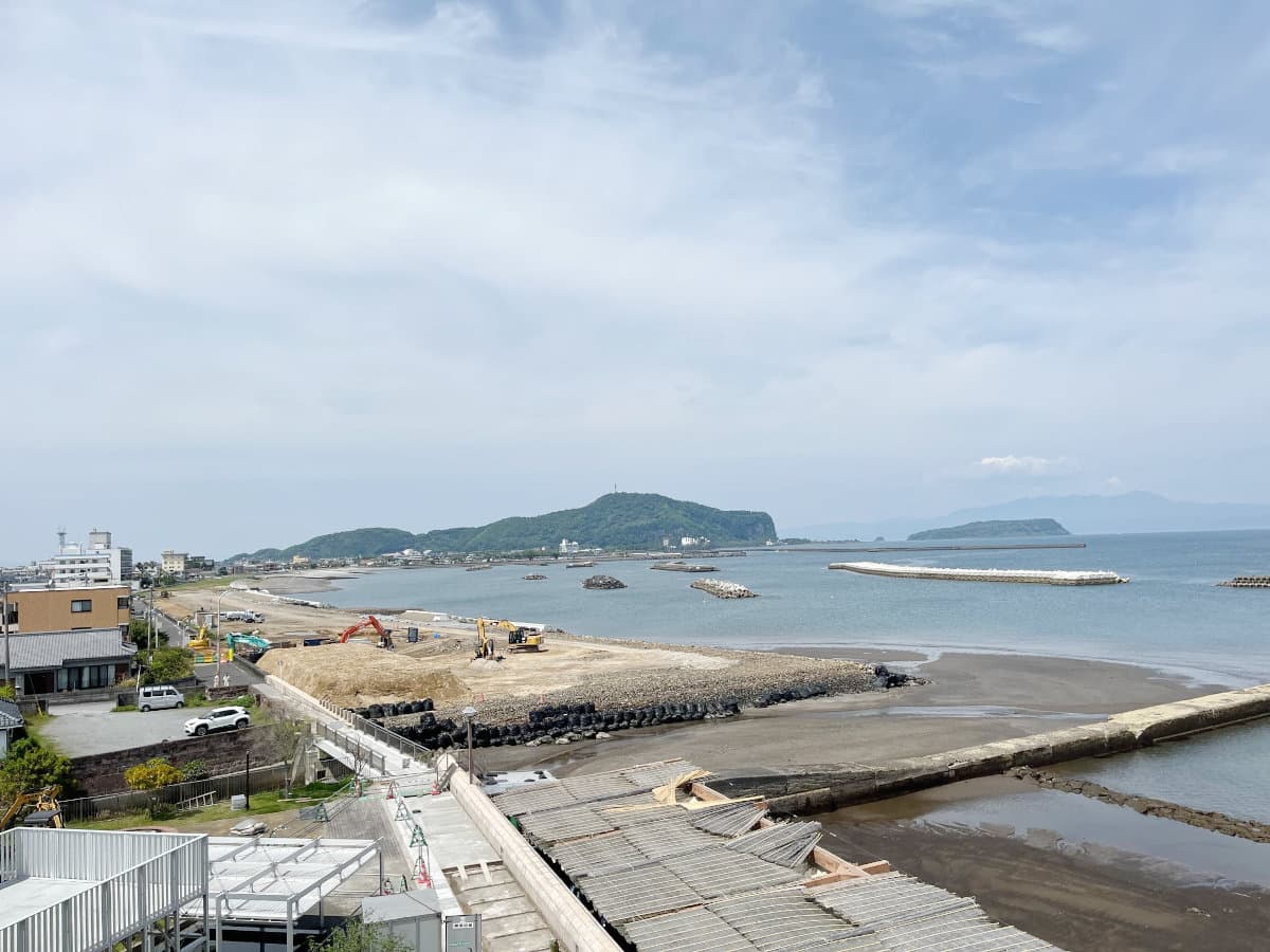 【 2026年現在 大規模な砂浜整備が進んでいます 】指宿に来たら、穏やかな錦江湾を眺めてみましょう。こちらの展望階段は、足湯ができる砂むしの里「交流の広場」にあります。