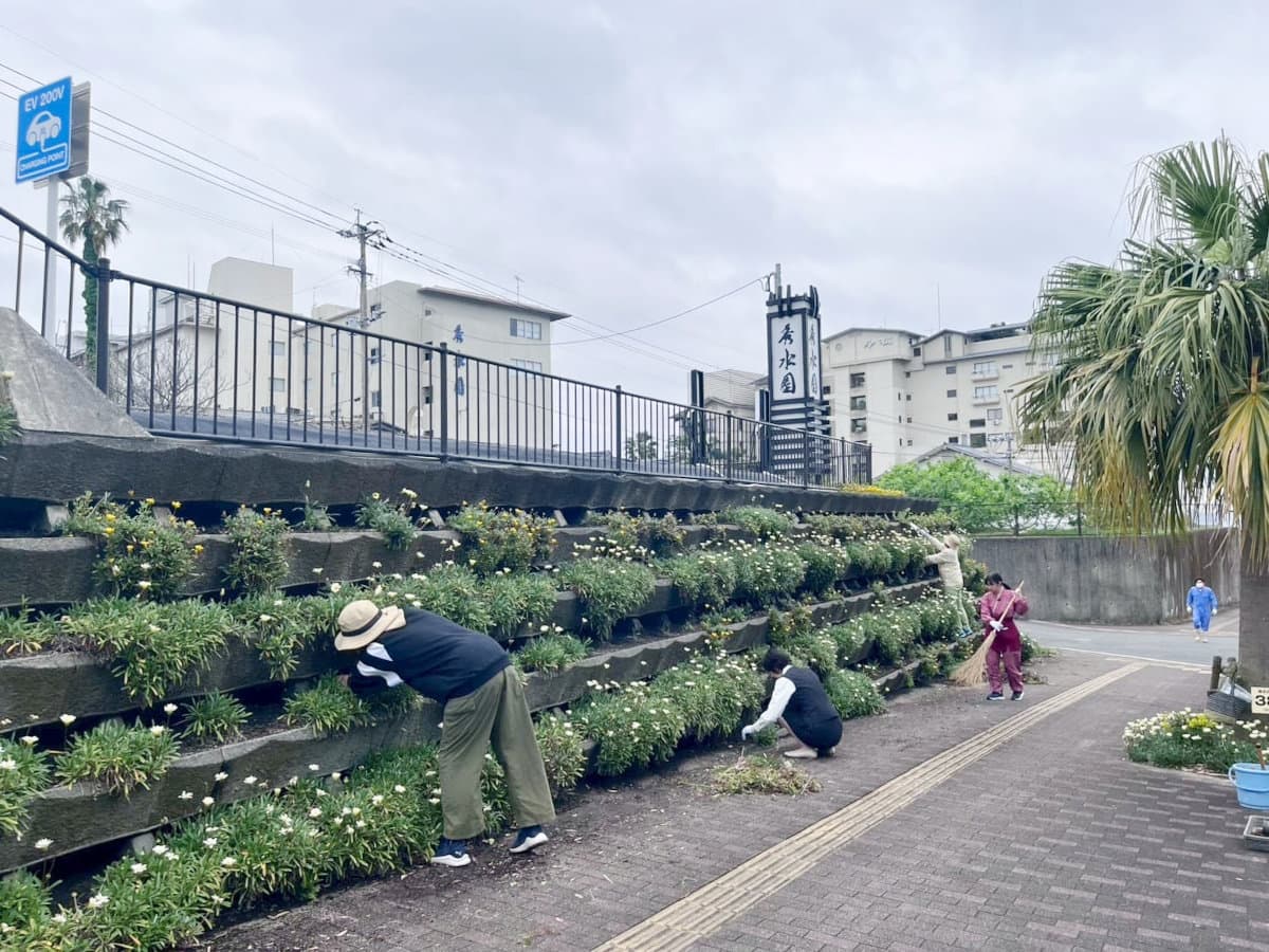 いぶすき秀水園さん近く。観光客の皆様をお迎する花壇は、摺ヶ浜 (すりがはま) 通り会の皆さんで管理されています。通られる際には是非ご覧ください。